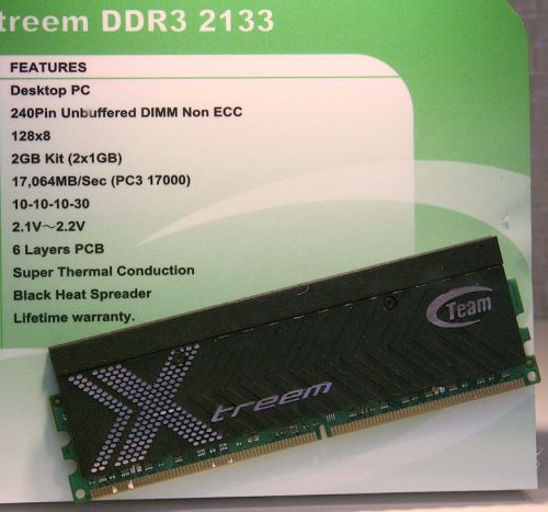 Ещё в начале января Team Group показывала модули DDR3-2133 с таймингами 10-10-10-30, которые работали при напряжении 2.1-2.2 В, и при этом ограничивались для охлаждения обычными радиаторами. Эти модули памяти снова были замечены на выставке CeBIT 2008.