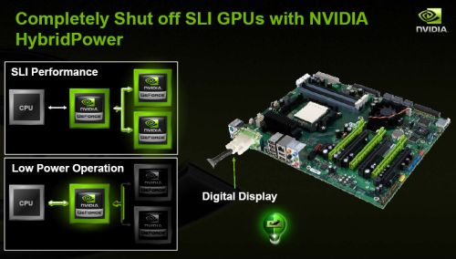 Рассказывая о технологии Hybrid Power от NVIDIA, наши американские коллеги предположили, что поддерживать её будут все видеокарты на базе 65 нм видеочипов компании. Официальный слайд из презентации говорил о том, что поддержку Hybrid Power обретут некие видеокарты нового поколения, которые будут выпущены в первом квартале текущего года. Позднее появилась информация о том, что видеокарты GeForce 9500 GT тоже будут поддерживать данную технологию.