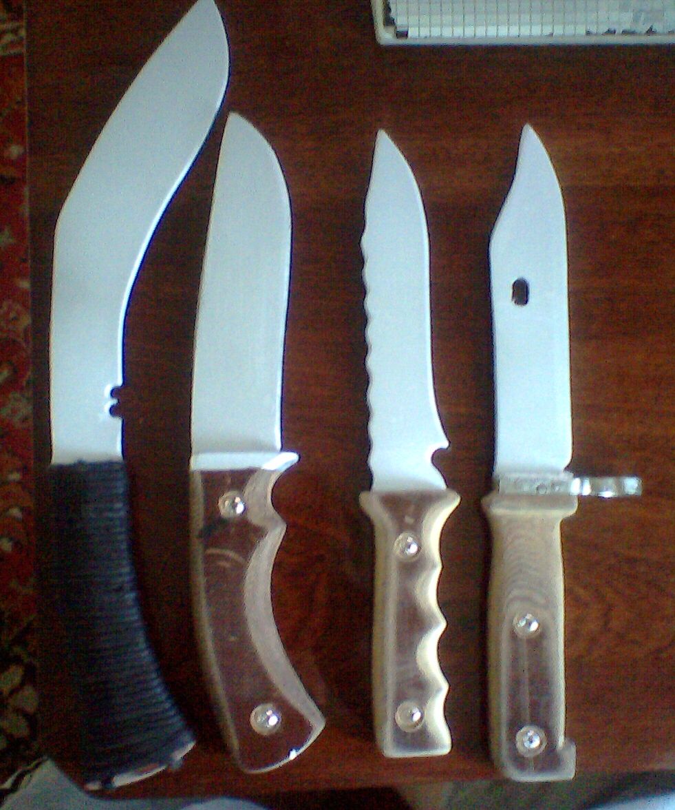на фото: Кукри (уменьшенный), охотничий нож, десантный нож (названия не помню), штык-нож от АКМ (200р)