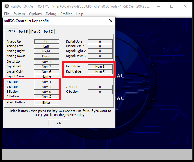 Кнопки переназначены так: L-3, R-5, A-2, B-0, X-4, Y-1 *все цифры на нумпаде